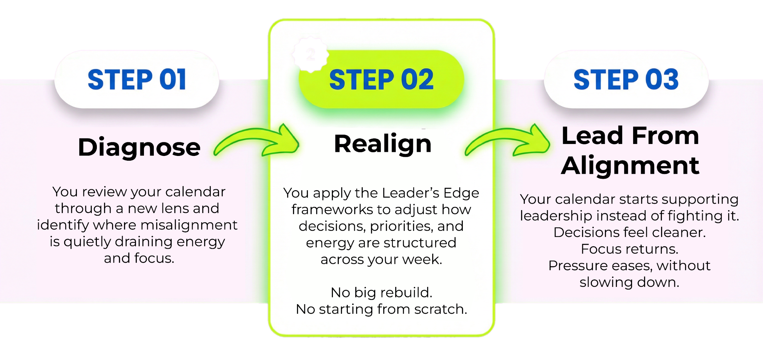 Leader’s Edge is an Executive Alignment System designed to help you fix the hidden calendar patterns that quietly drain energy, blur focus, and make leadership feel heavier than it should.