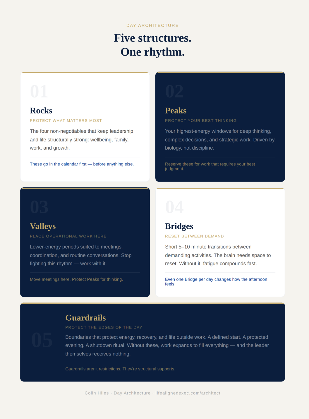 The five structures you can apply this week. Rocks, Peaks, Valleys, Bridges, Guardrails... explained simply, with room to apply each one to your own calendar.